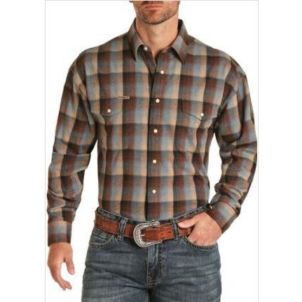 Powder River Outfitter style in a warm flannel men's shirt.