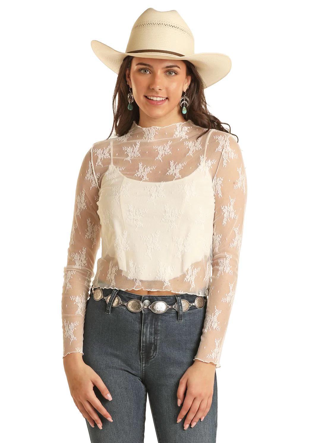 Rock&Roll Women's Shirt Mesh Lace Top in White
