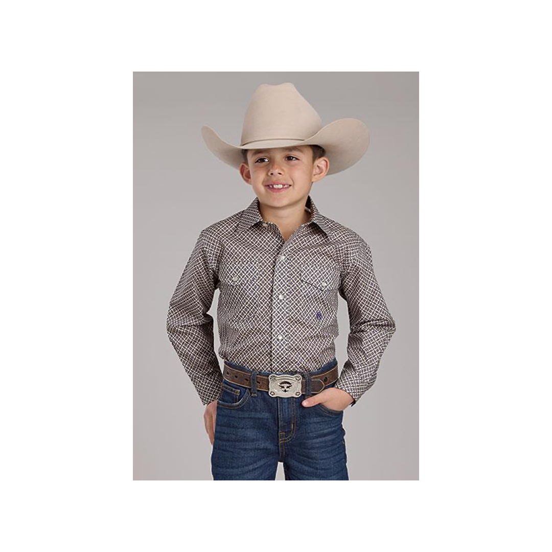 Let your little cowboy dress the part with the Roper Boys' Western Shirt in tan. Featuring classic Western yokes, pearl snap buttons, and dual snap chest pockets, this long-sleeve shirt delivers an authentic Western look with practical comfort. Made from durable, breathable fabric, it’s perfect for ranch days, rodeos, and everyday adventures.