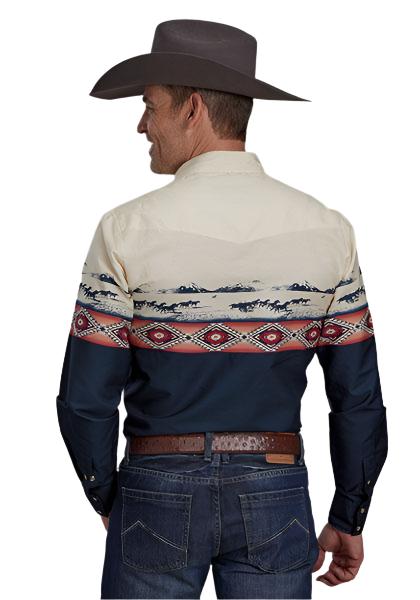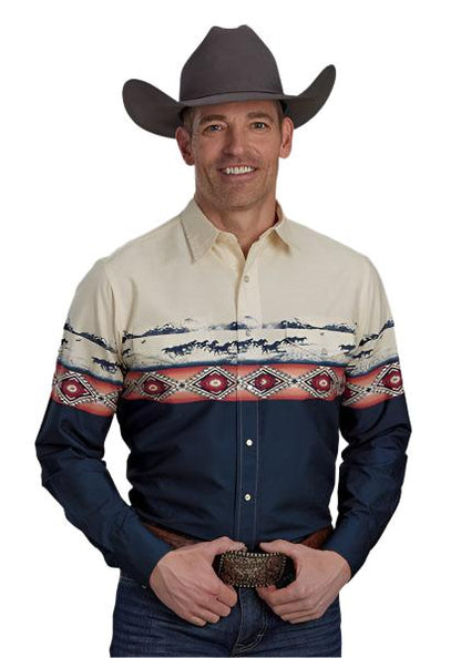Men's Long Sleeve Open Range Border Print Snap Up Shirt by Roper. Elevate your style with this Men's Long Sleeve Open Range Border Print Snap Up Shirt by Roper. Made of 100% cotton poplin, it features a unique vintage-style scenic print and a spread collar. With no front yokes and a garment washed finish, this shirt offers both comfort and style.