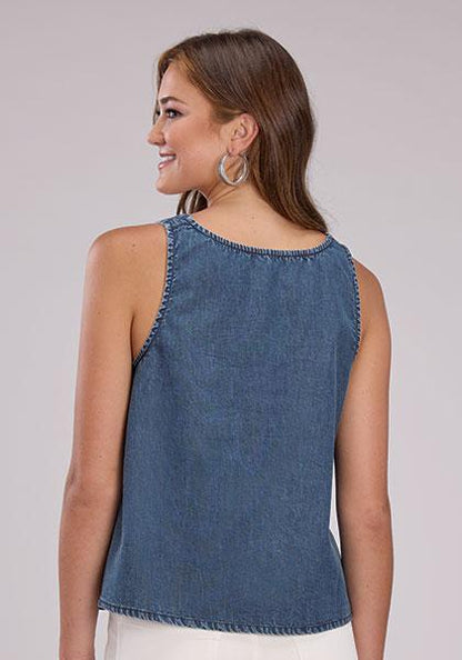 This stylish Roper Women's Denim Tank features a scoop neckline and unique belt buckle strap closures for a distinctive Western-inspired look. The fabric has been garment stone washed for a soft, worn-in feel and a fashionable finish.