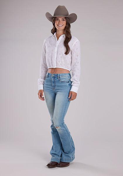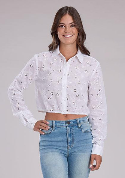 Women's White Eyelet Long Sleeve Blouse * Slightly Cropped Length * Elastic Hem * Button Closure.