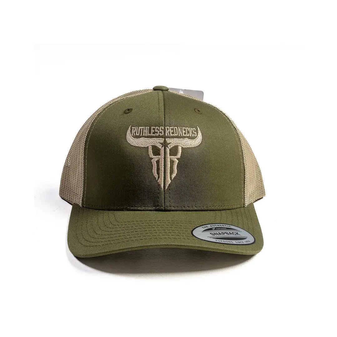 A mid-profile, six-panel curved-brim snapback hat from Ruthless Rednecks’ popular Raw Talent collection. It combines burnt-out cotton-poly fabric on the front with breathable nylon mesh at the back, offering comfort, durability, and style with rustic Moss-tone flair
