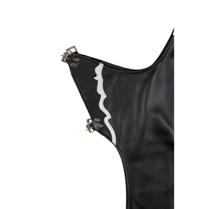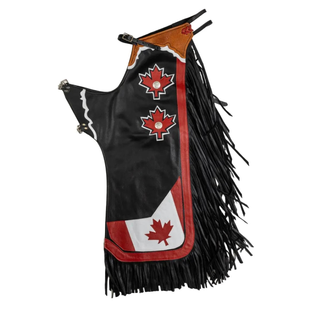 This rodeo chap has a full grain black leather, a brown leather yoke. Leg desgin has a special desgin with the red, white canadian flag. With black fringe all around the chap. Billet consists with a red, white canadian flag and silver concho in the middle.