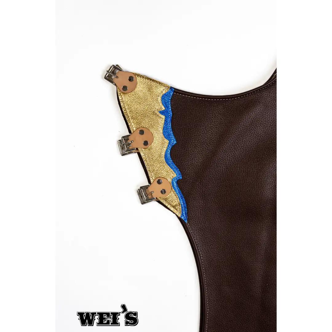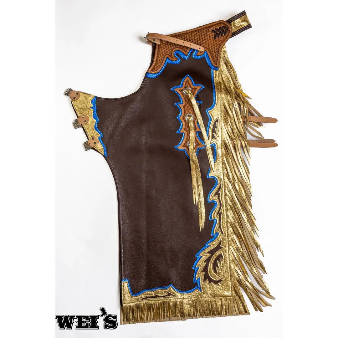 On the body of this rodeo chap has a brown full grain leather, with brown leather yoke. The leg desgin of this chap has a blue, gold outline desgin. Has gold fringe all the way around the chap. Billet consits of brown, blue and gold with a silver concho and gold fringe.