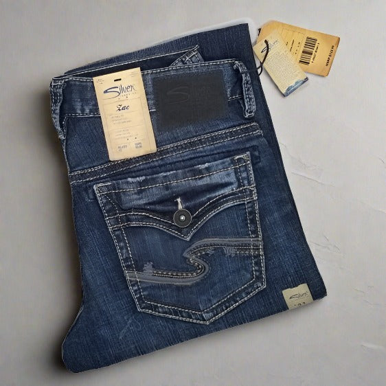 Silver's Zac sits just below the waist and features a relaxed fit through the hip and thigh. It's crafted with our comfort stretch denim that's great for everyday. This pair features a dark indigo rinse with subtle hand sanding and whisker patterns and is finished with a classic straight leg.