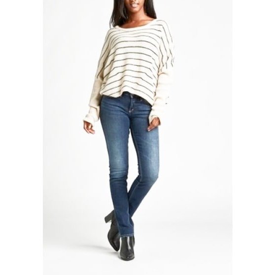 Suki is the ultimate curve-flattering jean, featuring a comfortable mid rise and relaxed fit through the hip and thigh. It's crafted in super-stretch denim that's lightweight and incredibly comfortable. This pair is washed to a dark indigo shade with natural hand sanding and whisker patterns.