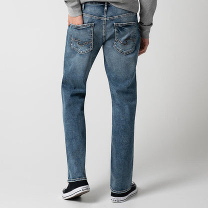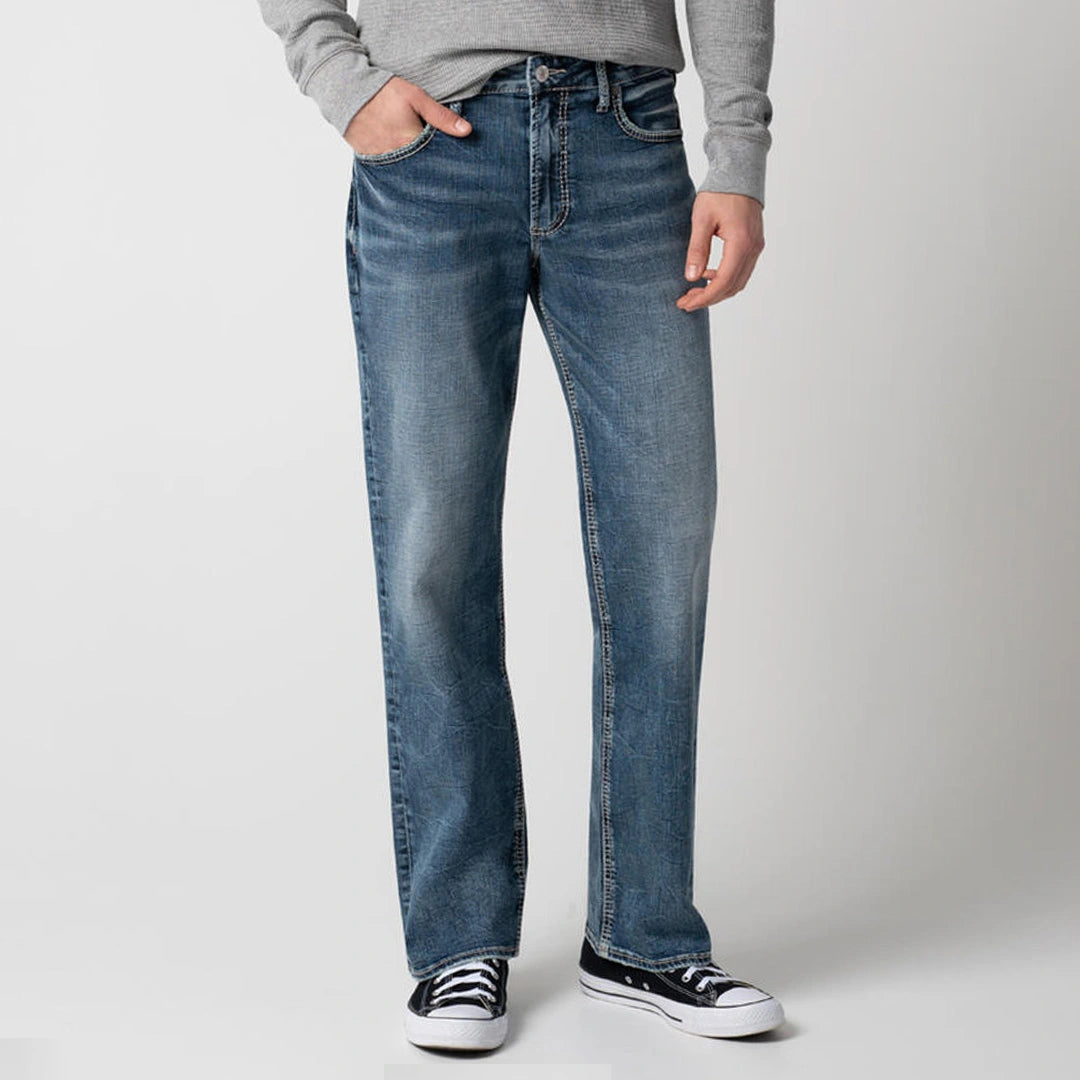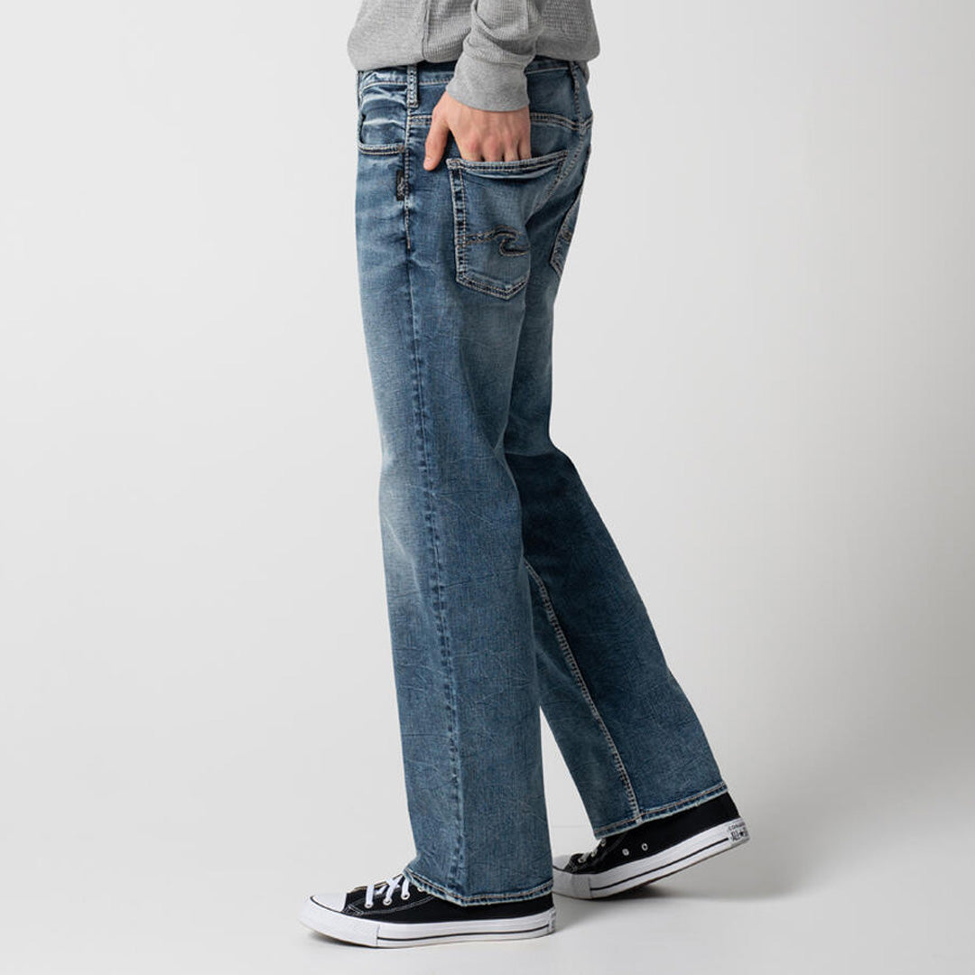 Perfect for larger builds, Silver's Gordie sits at the waist and fits extra loose through the hip and thigh. It's designed in performance stretch denim with ultimate flexibility and mobility for guys who are always on the go. This pair is washed to a medium indigo shade with heavy tacking, hand sanding and whisker patterns. Finished with a classic straight leg and s-scrolls on the back pockets.