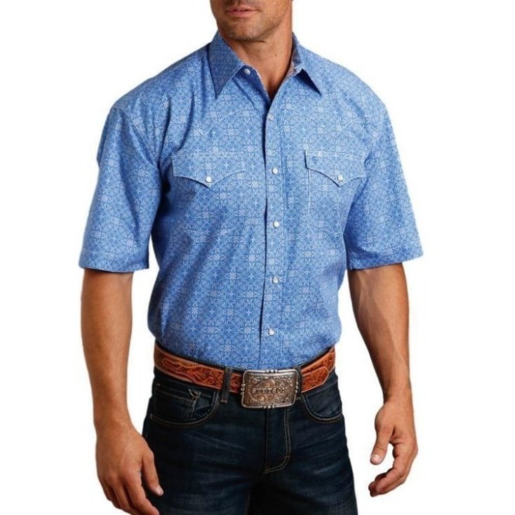 This Men's Stetson Western Shirt features traditional style in a cool blue Summer shirt. It also has an all over print, a snap front and a 1 point ultra deep curved back yoke.