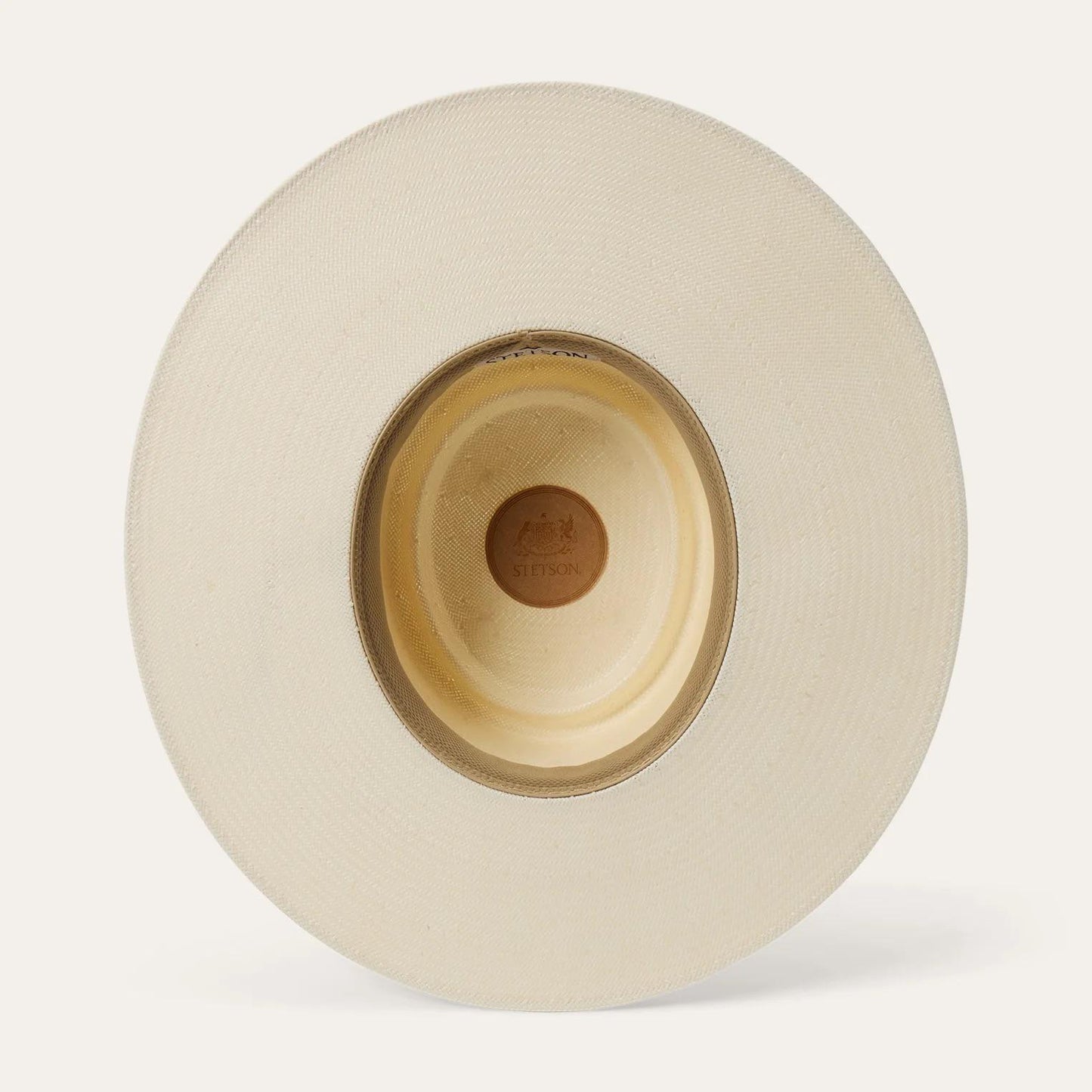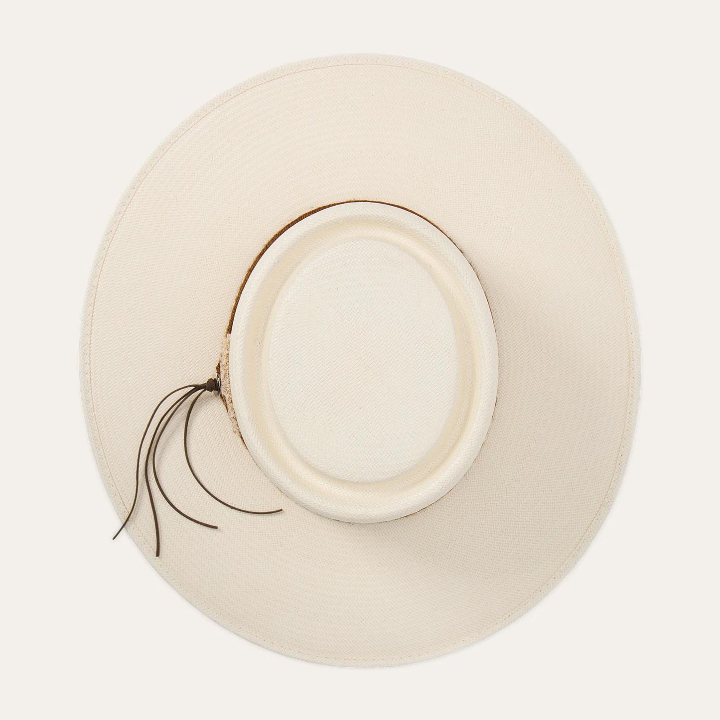 A statement-making straw fashion hat, the Oasis combines our legendary craftsmanship with a bold silhouette and eye-catching details. Handwoven one strand at a time from high-quality 100% shantung straw, it has a 4 ⅛” telescope crown with a 4” flat brim, and it’s fitted with a leather hat band with rawhide accent and silver-tone concho and striking knit fabric detail. A genuine leather sweatband provides a comfortable, time-tested fit..Lightweight, durable, and made to retain its shape, it’s an ideal, stylish companion for any warm-weather occasion.