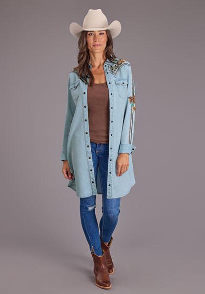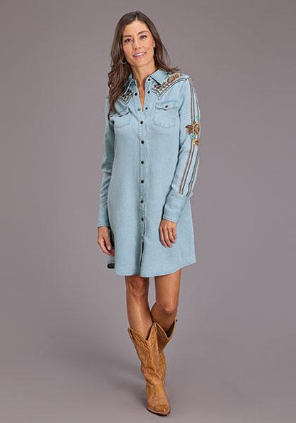 Women's light blue lyocell denim western style shirt dress,Single point front and back deep curve yokes, single point pockets and flaps, 5 snap cuffs, Garment washed for softness, Embroidered.
