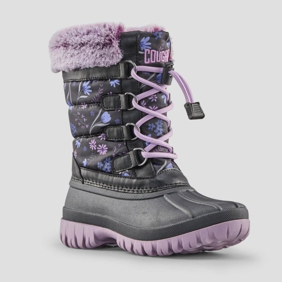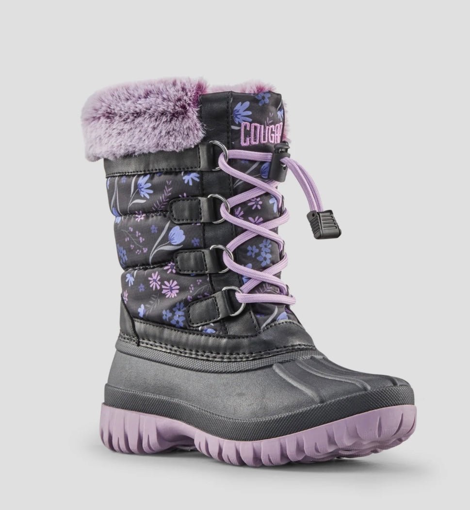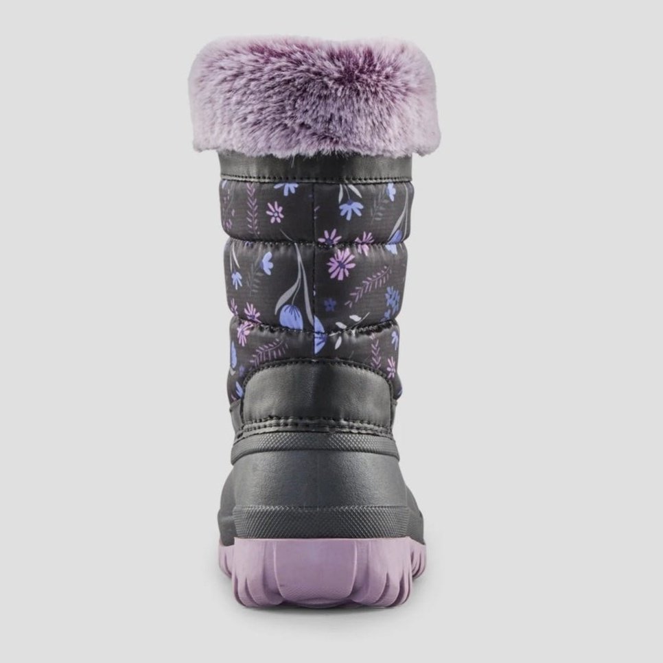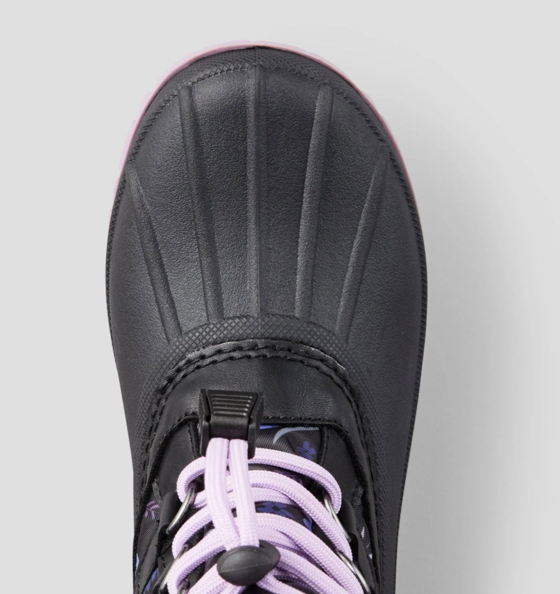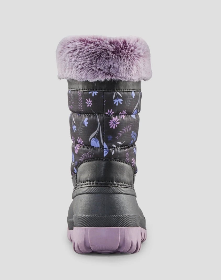 Easy pull-on nylon winter boot with front 4-eye stretch lace/toggle. Waterproof base. Faux fur collar. Thermoplastic rubber shell outsole.