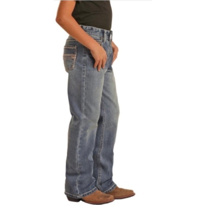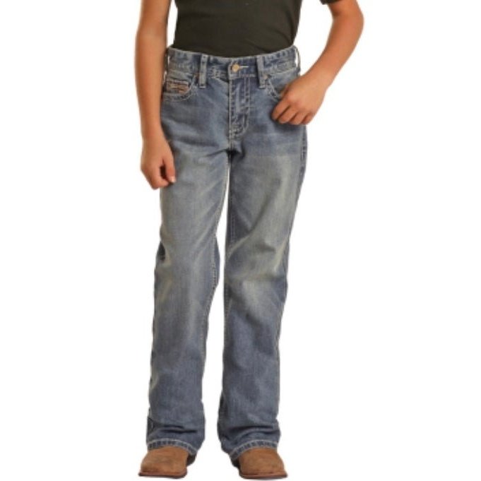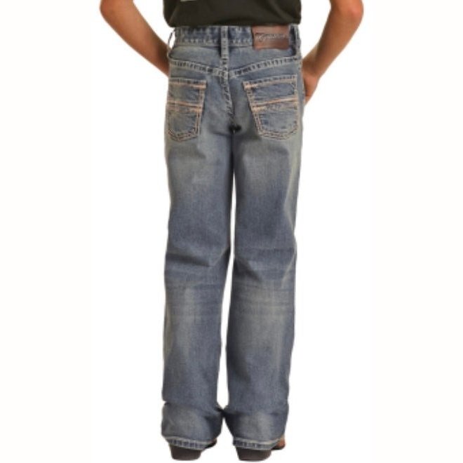The Rock & Roll Boy's Regular Fit Stretch Bootcut Jean in a medium vintage color offers a comfortable and stylish option for young cowboys. These jeans feature a classic bootcut style, designed to fit well over boots. They are made from a blend of 99% cotton and 1% spandex, providing a stretch fabric for enhanced comfort and flexibility during wear. A distinctive detail is the ivory stitch pocket, adding a subtle contrast and touch of style.