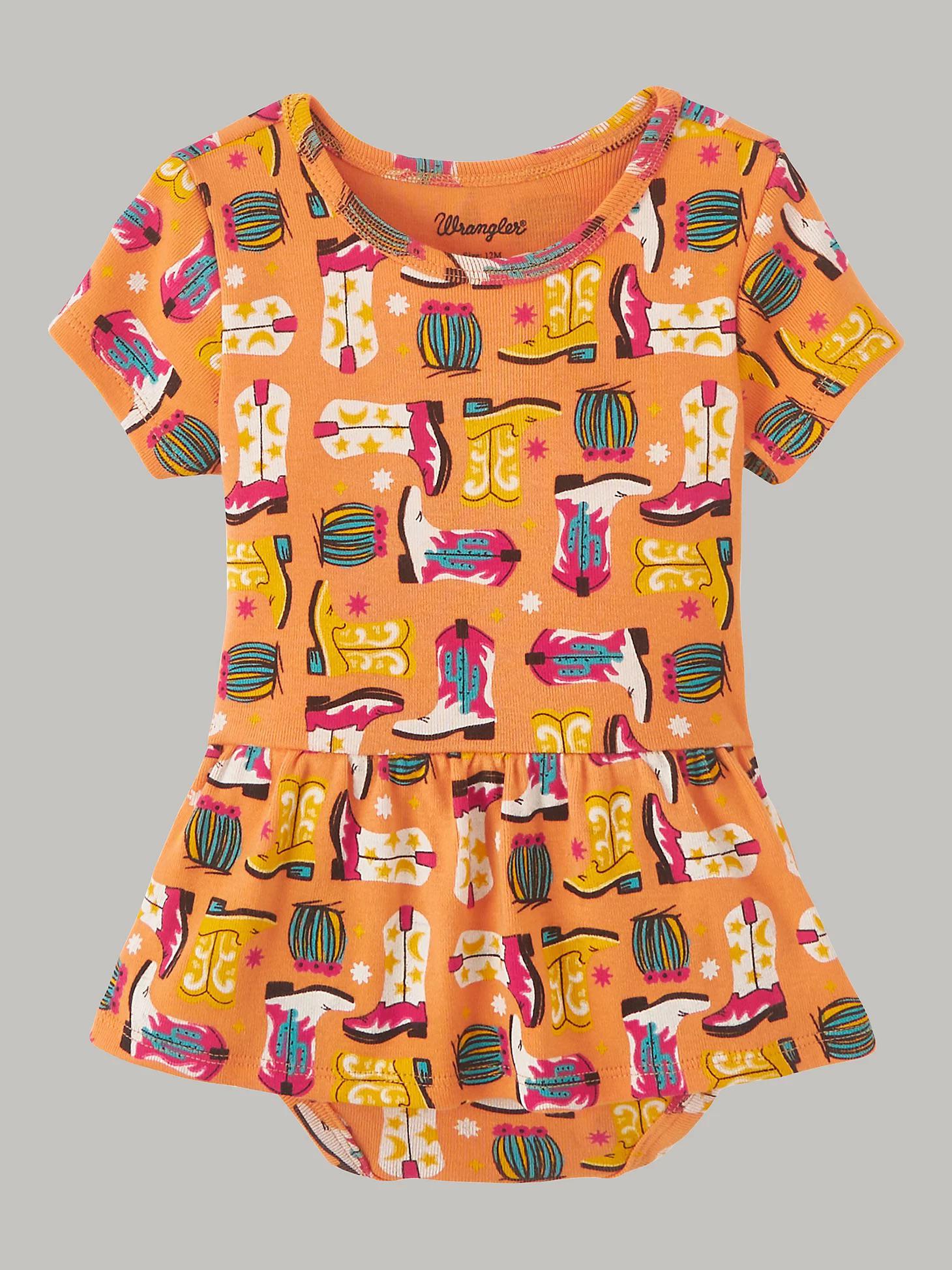 Celebrate cowgirl-cool and cowgirl-cuteness with the baby girl’s wrangler boot skirted bodysuit. This extra-soft 100% cotton bodysuit features a vibrant allover cowboy boot print, with a ruffled dress and built in diaper cover that kick up the cuteness.