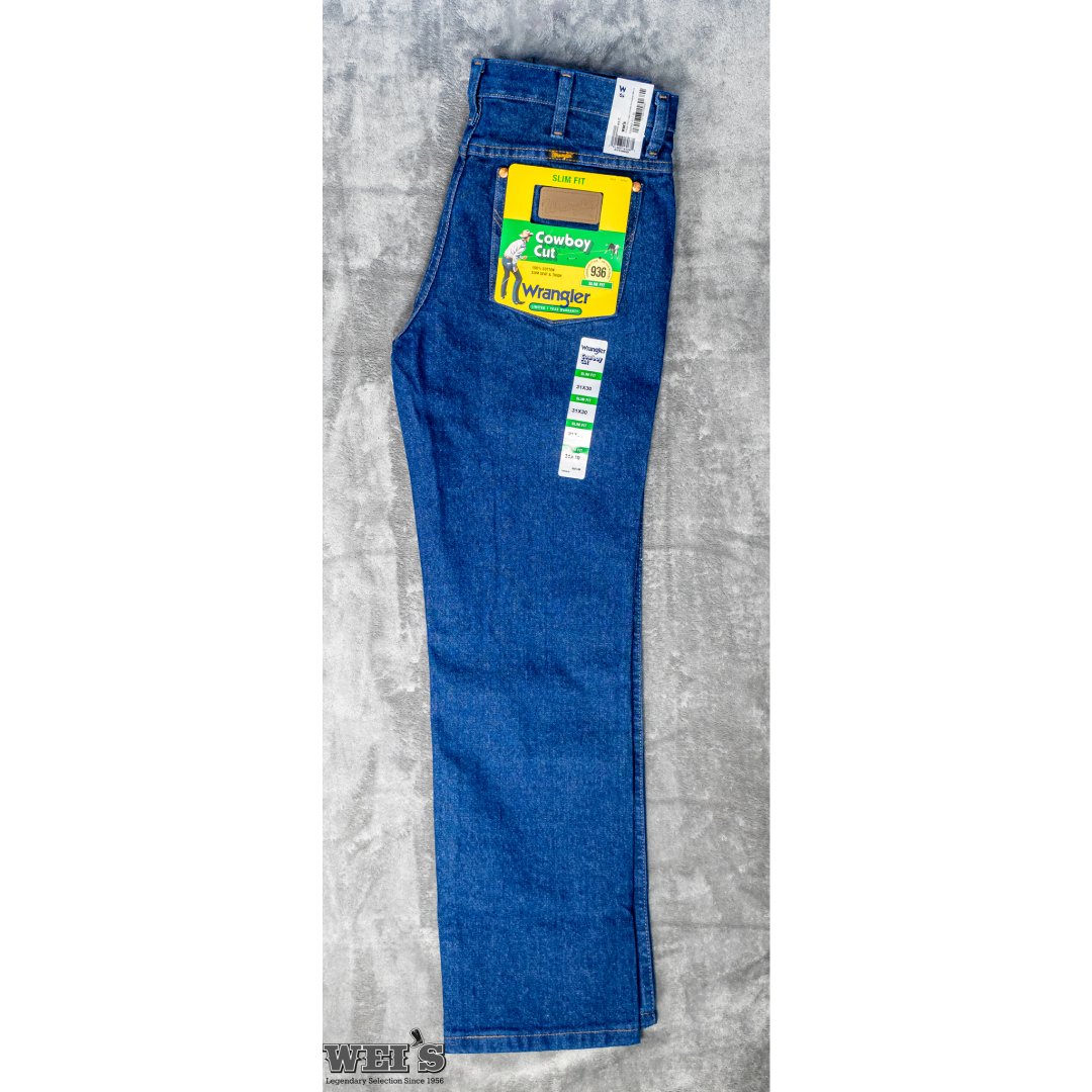 The classic Wrangler jean, in a slimmer cut for a modern look. Sits at the waist. Boot-cut. Slim throughout the seat, thigh and knee. Wrangler® Cowboy Cut® jeans are a tried-and-true wardrobe staple for cowboys who demand a lot from their everyday clothes. Our men's Cowboy Cut® 0936 comes with all the same iconic details of the 13MWZ, including the classic neolite patch, five-pocket styling, and that signature 'W' stitching you know and trust. What makes the 0936 jean a must-have for every modern cowboy is its slim silhouette through the seat, thigh, and knee. Whether dressed up for a special occasion or dressed down for a backyard barbecue, these men's Cowboy Cut® Wrangler jeans will keep you comfortable all day long without compromising style