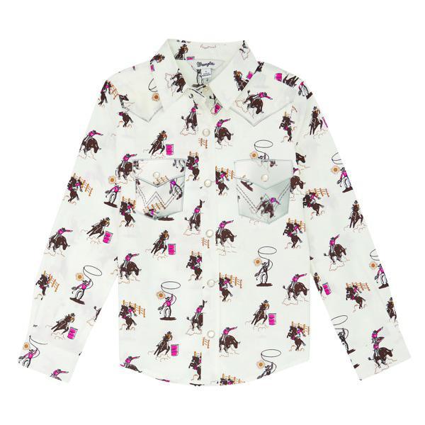 Wrangler Girl's Rodeo Cowboy Print Long Sleeve Snap Shirt