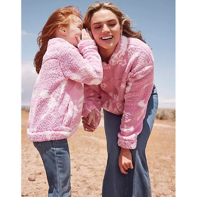 When the temperature dips, the fun doesn't have to. Turn to the Wrangler® x Barbie™ Girl's Western Sherpa Jacket to help her keep the warmth in check. Its Western yoke styling is topped off with a Barbie™ riser label exclusive to this collection. With a regular fit, zip closure, hand warmer pockets, and playful Barbie™ stars and silhouette pattern, your daydreamer will grab this pink and soft layer again and again.