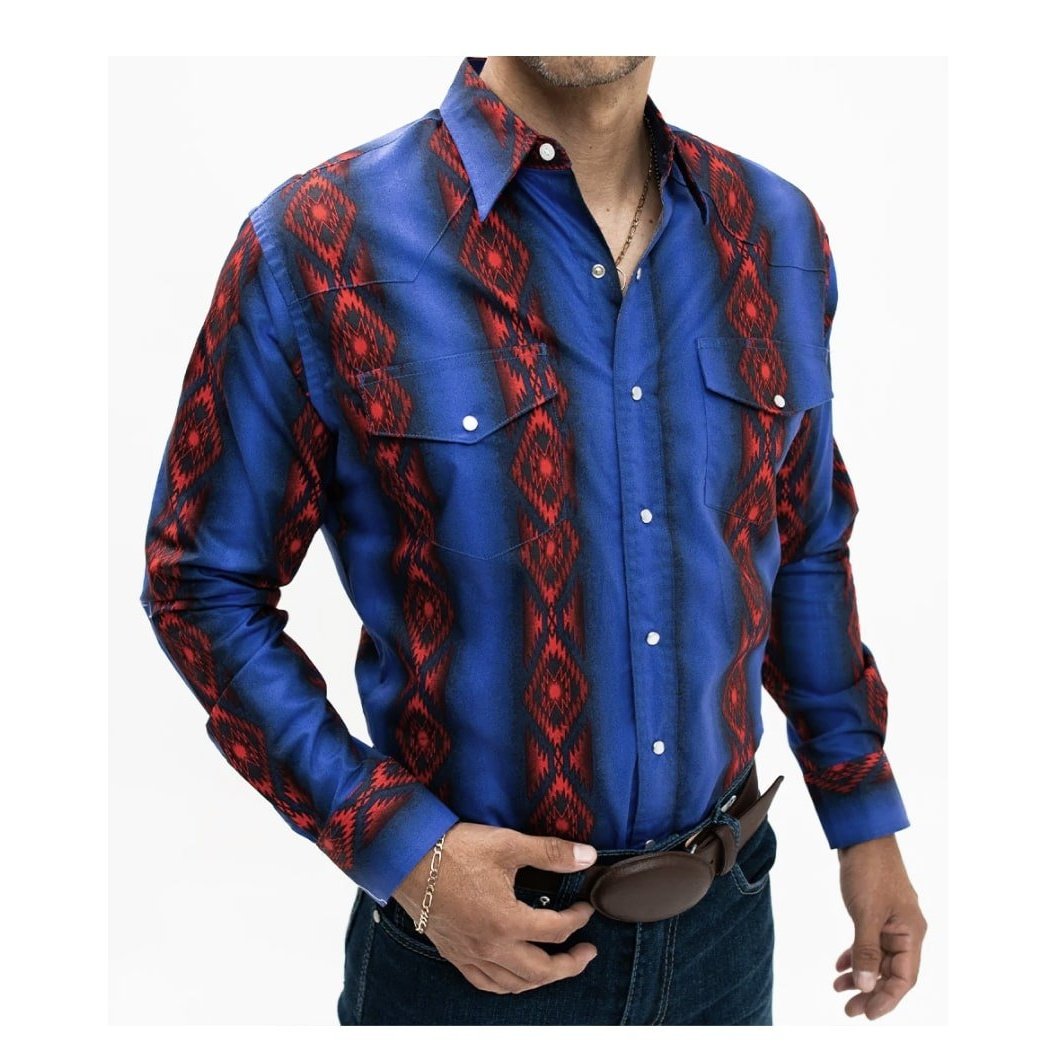 Wrangler's dynamic Aztec-inspired motif in saturated colours is a true classic Western shirt. sets this tailored shirt apart. It features details such as Western-style yokes, snap closures and flap pockets.