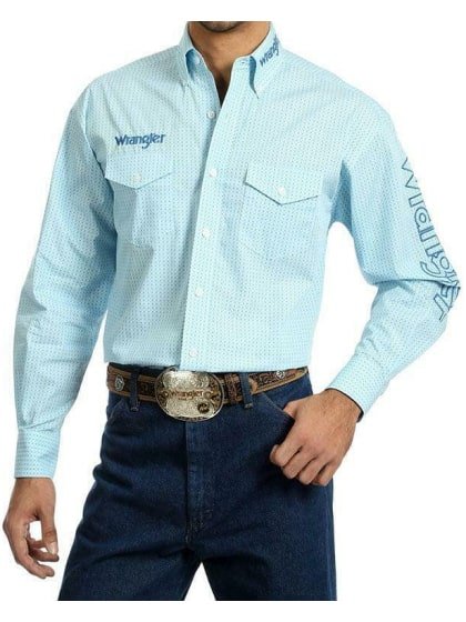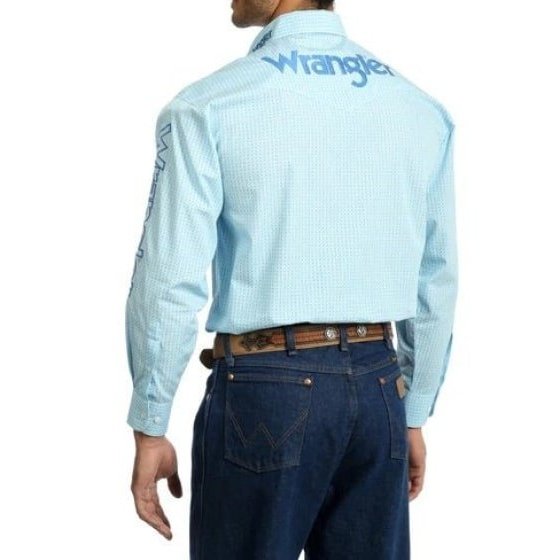 When it comes to Western button-up shirts, cowboys across the country trust Wrangler for long-lasting comfort and quality. This Western Wrangler logo long sleeve button-up shirt is no different. It features all the tried-and-true details you love and know.