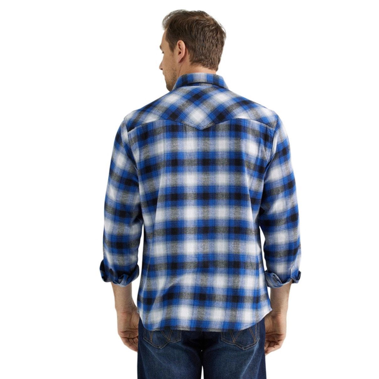 Stay warm and stylish with the Wrangler Men's Dark Blue and Black Plaid Retro Flannel. This classic flannel shirt features a rich blend of dark blue and black in a timeless plaid pattern, perfect for layering or wearing on its own. Crafted from soft, high-quality fabric, it provides comfort and warmth for chilly days. The button-up front and chest pockets add functionality, while the retro design gives it a vintage-inspired flair. Ideal for casual outings or cozy evenings by the fire, this flannel shirt is a versatile addition to your wardrobe that never goes out of style.
