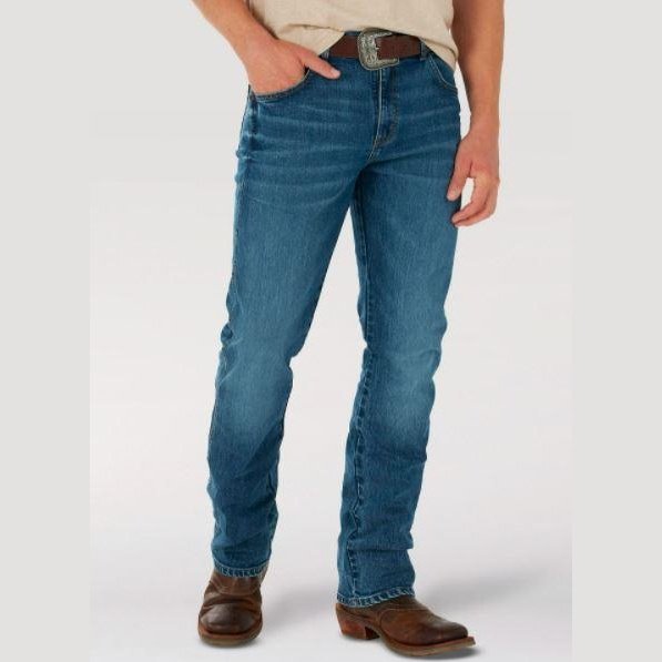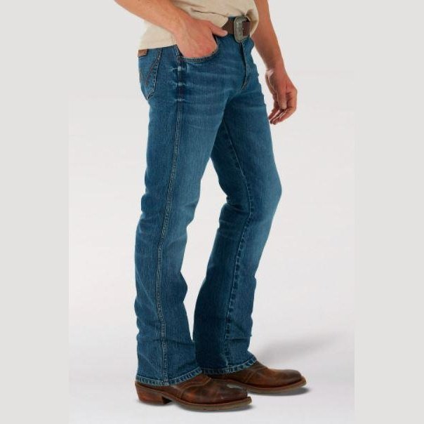 These Wrangler Retro men's slim bootcut jeans feature a streamlined silhouette through the seat, thigh, and knee, but the leg widens from the knee downward, which is good news for boots.