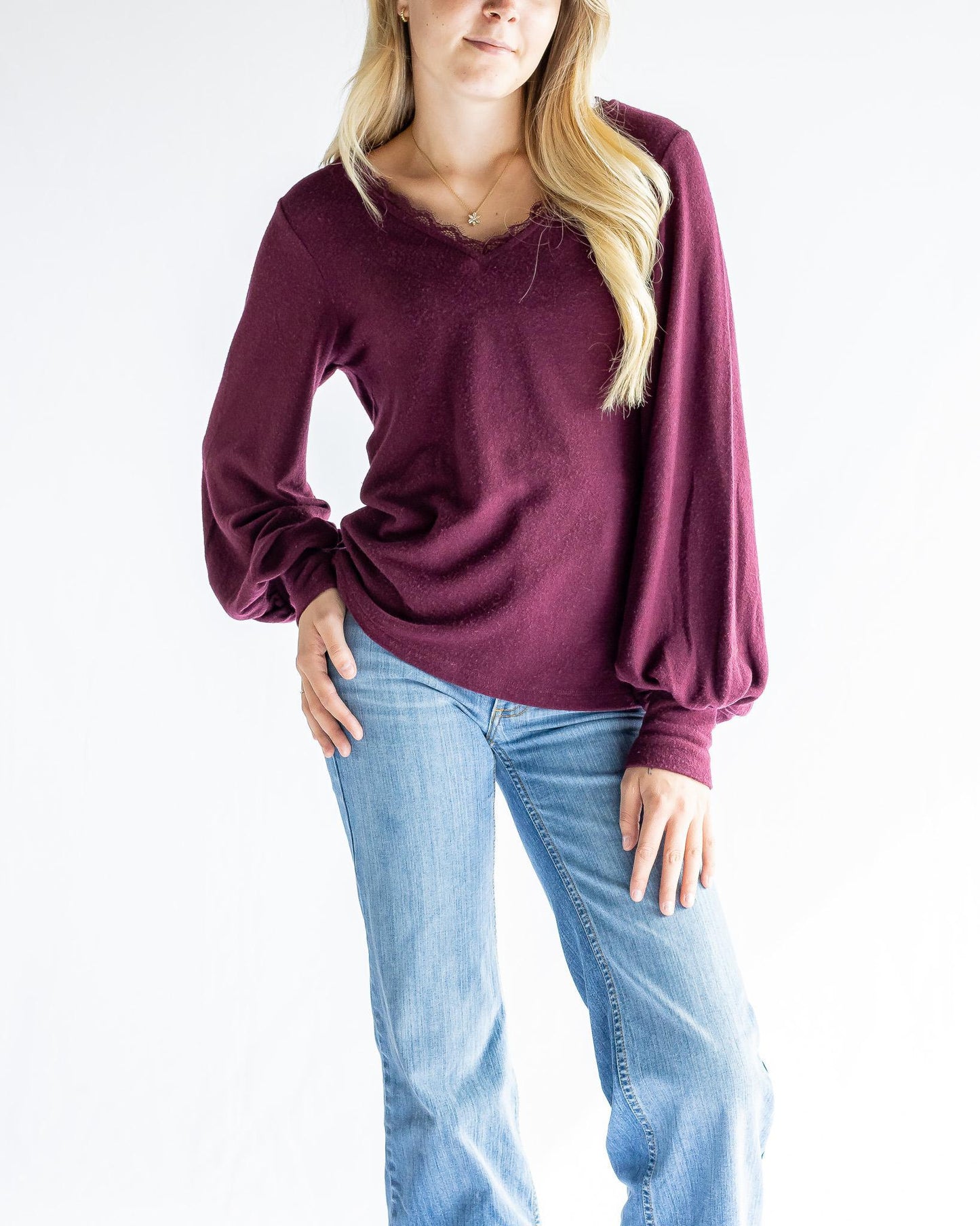 This top will adda touch of elegance to any pair of slacks or jeans. With its long balloon sleeves, v-neck and lace ruffle, give yourself a lift wherever you go.